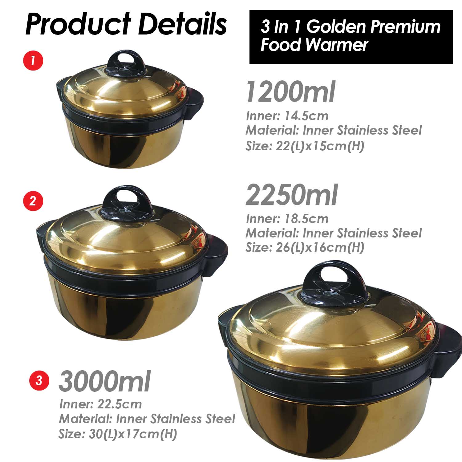 | Highlights | 1. Elegant gold design suitable for special and festive occasion. 2. Made with high-quality materials for long-lasting use. 3. Designed to maintain the temperature of your favorite dishes for hours. 4. Keep your food warm and delicious. 5. Food safety that avoid food contact with plastic material. 6. Suitable for rice, dishes, condiment, dessert. 7. With its stackable feature, you can easily stack multiple food warmers on top of each other. |