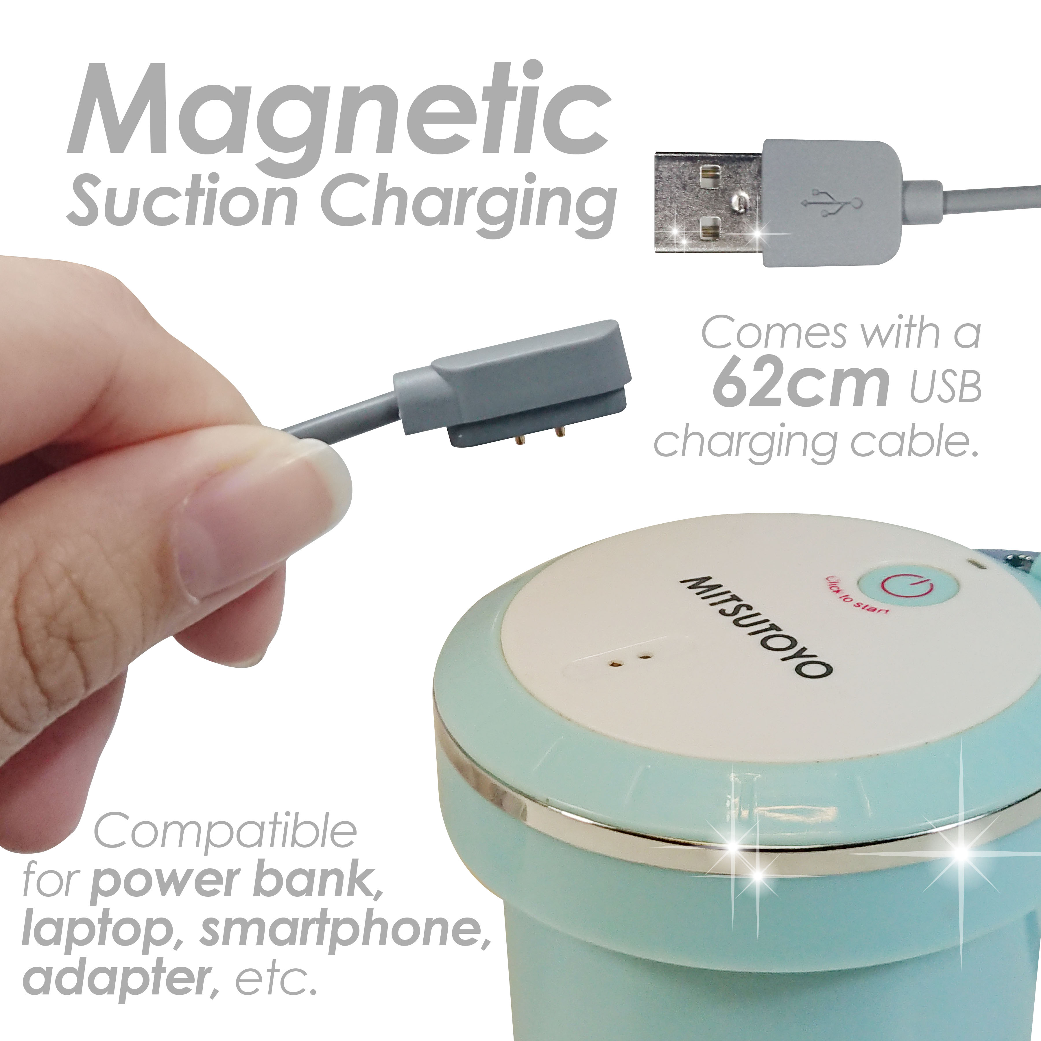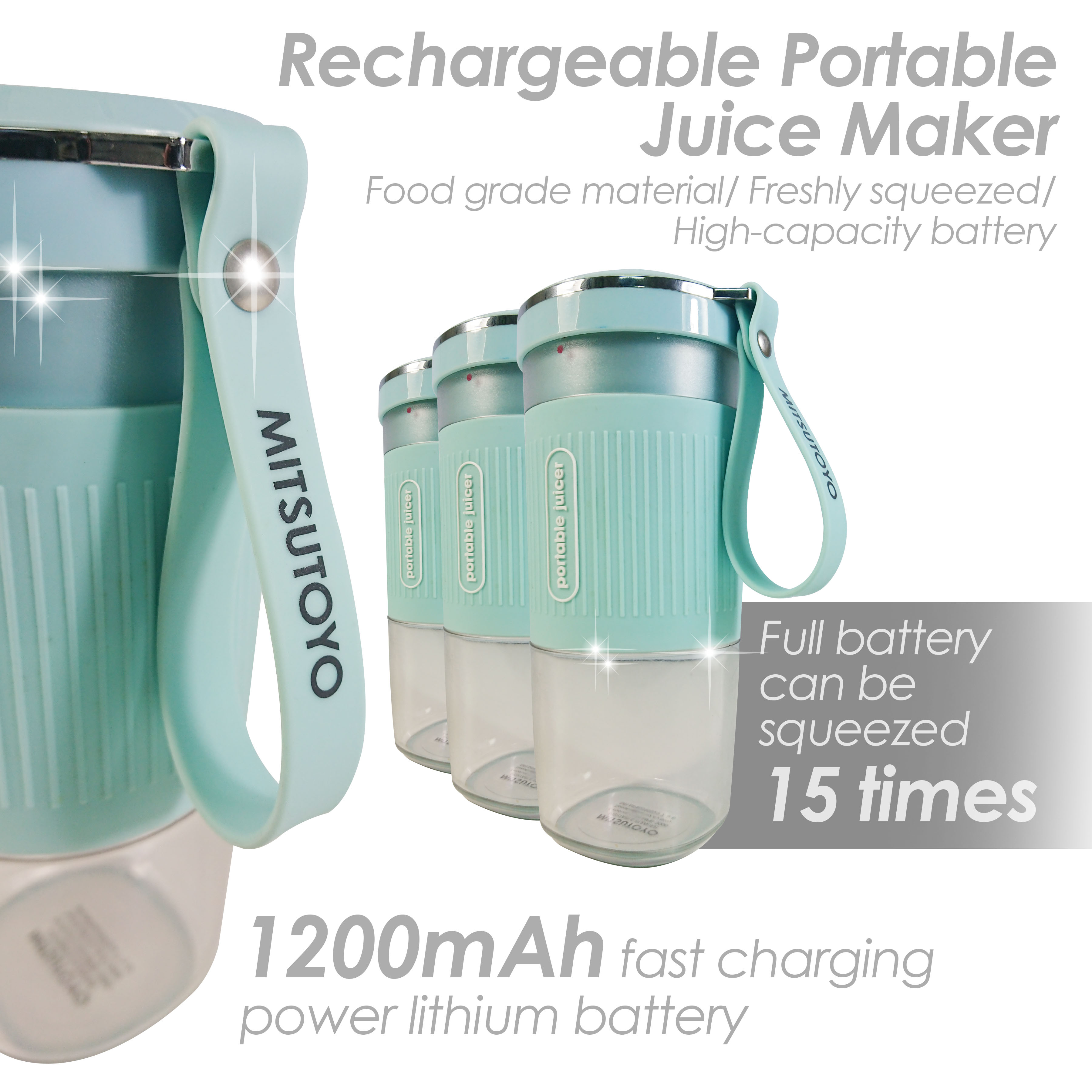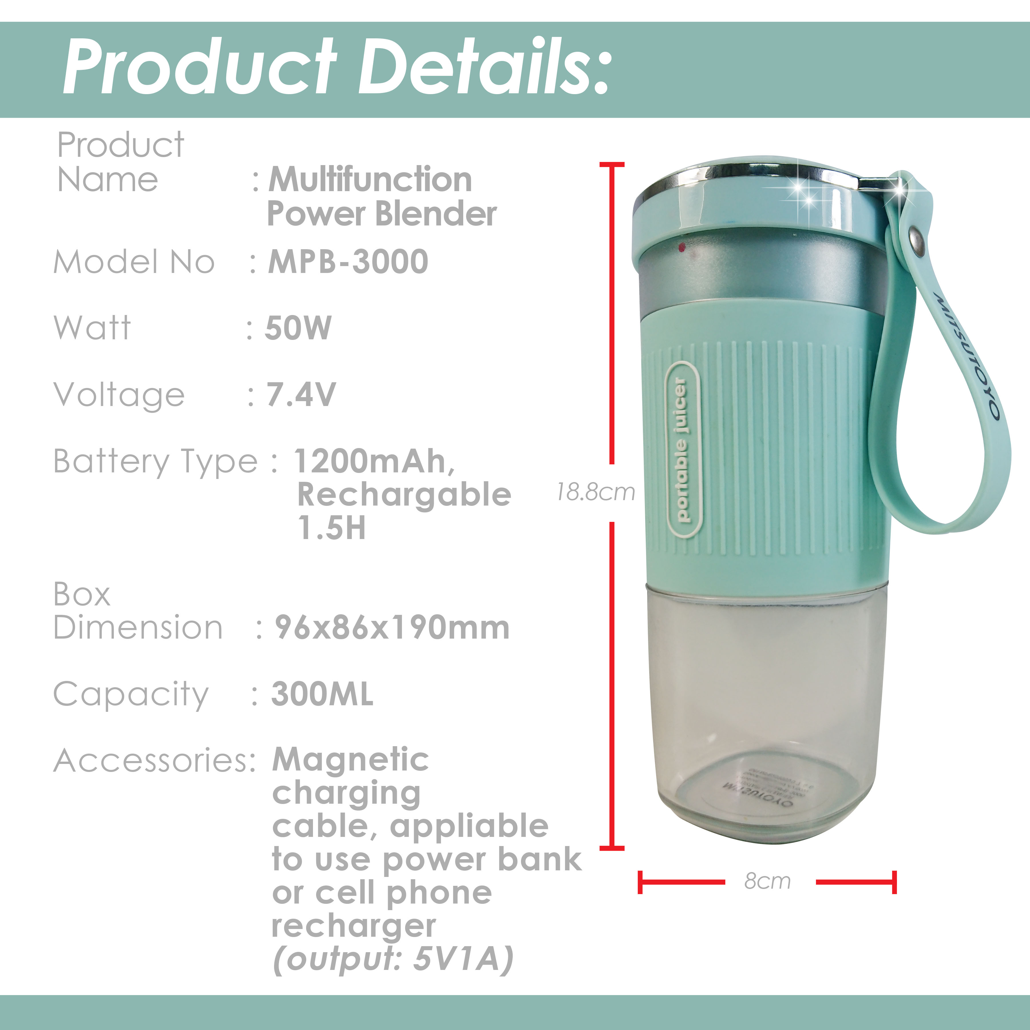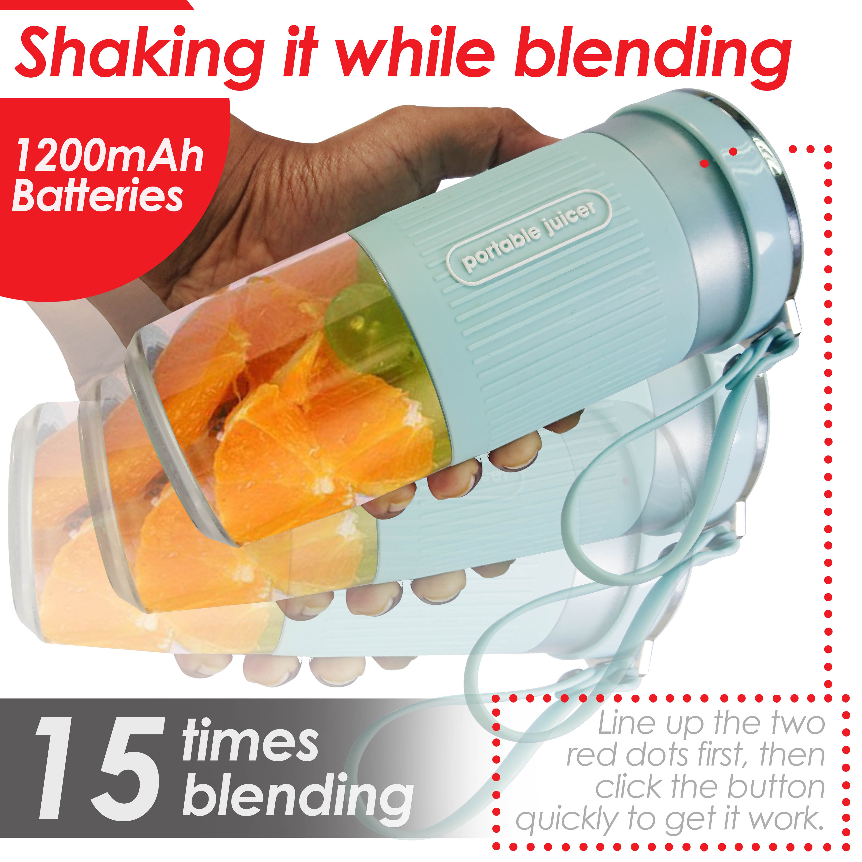 | Highlights | 1. Multi function protable blender 2. Large capacity blender bowl 3. Non-slip soft rubber sleeve 4. 2 stainless steel blades that are durable 5. Fully waterproof - whole blender covered can be rinsed under running water 6. Fast charging power lithium battery 7. Compatable with power bank, laptop, smartphone, adapter, etc |