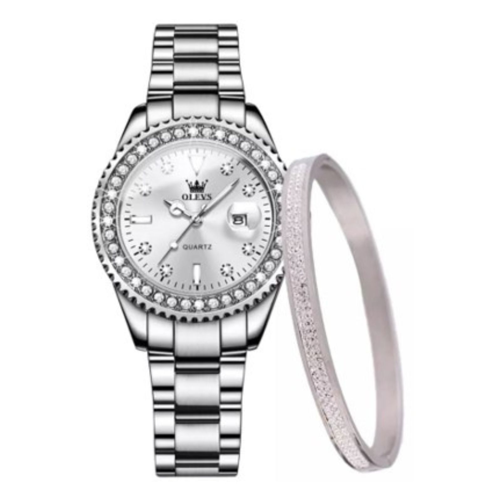 | Highlights | – Case Dimension: 25 * 33 mm – Case Thickness: 9mm – Case Material: Stainless Plating – Glass Material: Durable Coating Eyeglass Strap Material: Stainless Steel Strap – Strap Color: Silver – Movement: Japanese Quartz Movement Water Resistant Level: 3 ATM [ Life Waterproof ] – Colors: White Silver Crystallize Bangle Material: Stainless Titanium Dimension: Approximately 20 cm 40 diamonds on the watch Bangle come with approximately 88 pieces diamond cobalt. |
