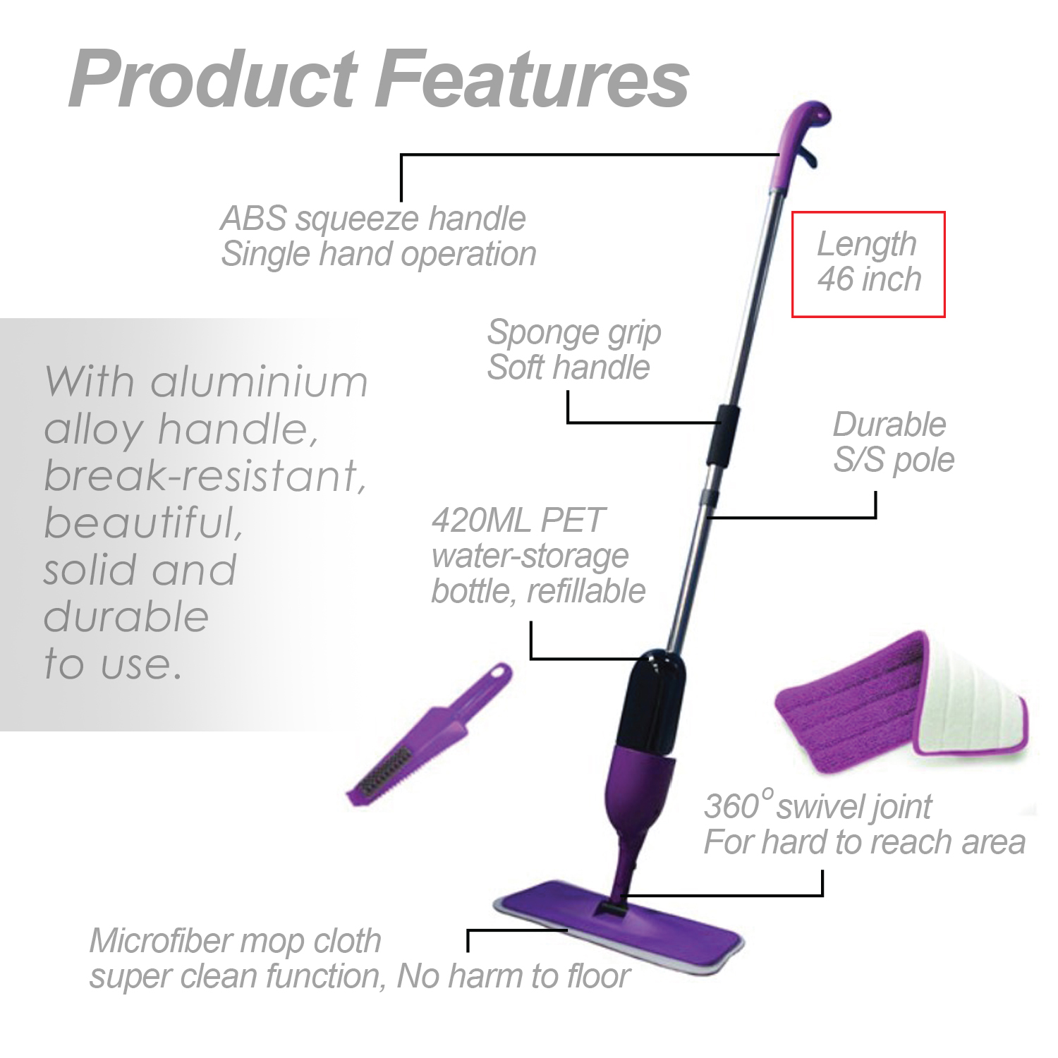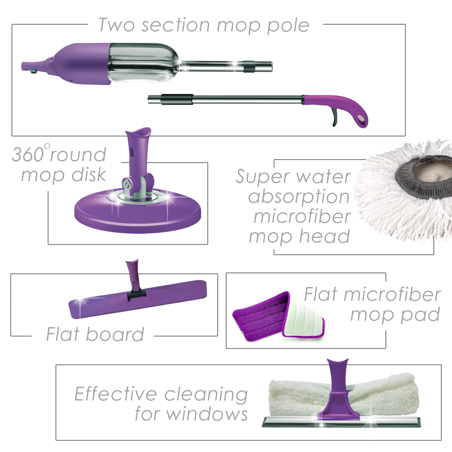 | Material / Ingredients | - Microfiber pad can be used to sweep the dust and hair - 360 rotating mop head helps to eliminate stubborn dirt - Slim design broom head and 180-degree rotation handle - 3 spinning brushes to reach difficult corners - Micro fabric mop pad that an be easily removed and washable |